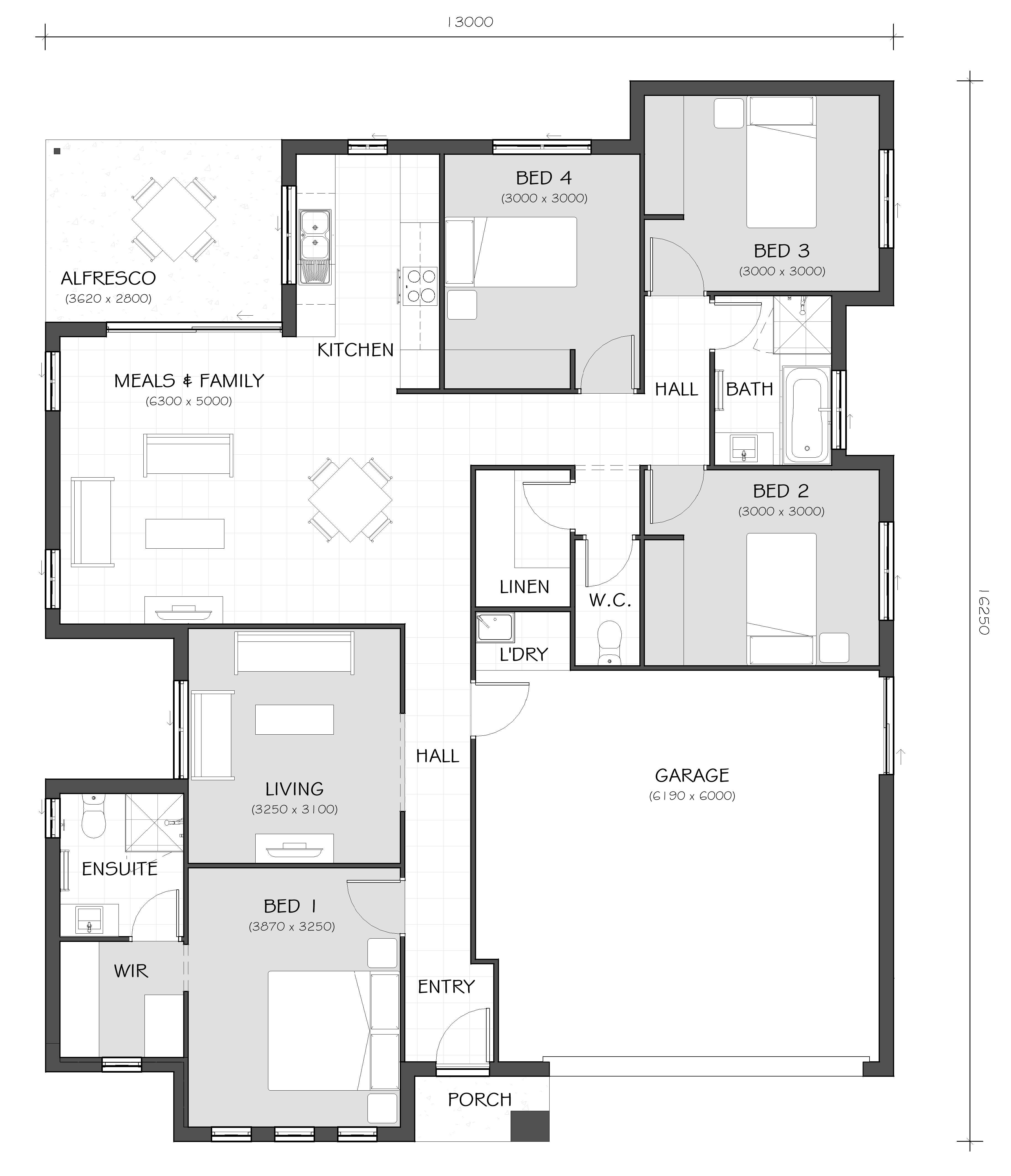 The Cougal floor plan coupled with the Waldorf façade presents a commanding street appeal with wide street frontage. Comprising of 4 bedrooms, 2 bathrooms, 2 living areas, a large walk-in linen cupboard, expansive open kitchen/meals and family area opening up to a covered alfresco area through double glass sliding doors.