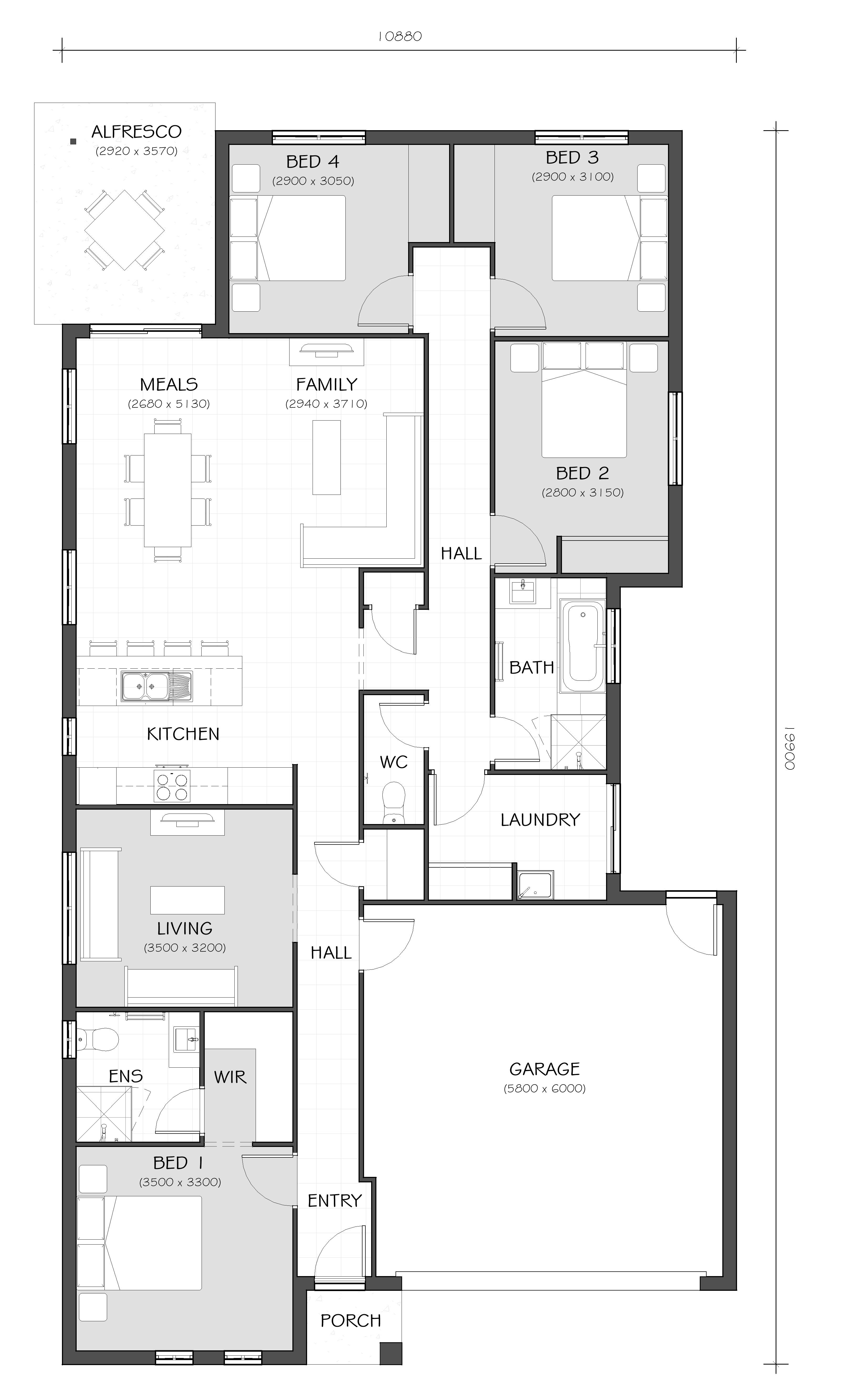 The Montage Classic is a timeless façade with a strong street appeal. With 4 bedrooms, 2 bathrooms, 2 living areas, kitchen with island bench looking through the meals and family rooms to the outdoor entertaining area.